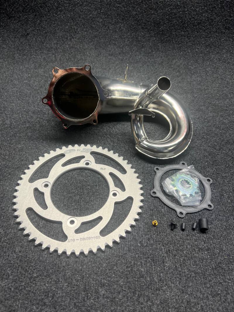 Le kit débridage pour vos Beta RR 50cc EURO5 d'après 2021. Celui-ci permet de libérer le moteur Minarelli AM6 afin qu'il monte en régime normalement. Comme les plus grosses brides sont placées au niveau du collecteur d'échappement, ce kit est doté justement d'un autre modèle vidé, en même finition chromé, qui se monte en lieu et en place. Évidemment comme le moteur s'exprime mieux, le kit prévoit un pignon et une couronne pour rallonger la transmission, et enfin un gicleur principal plus gros pour enrichir la carburation. Il ne restera plus qu'à changer le CDI de la moto par un modèle du type BOITIER CDI DÉBRIDÉ DOPPLER, pour finir de débrider complètement la moto et pouvoir ainsi en profiter normalement.