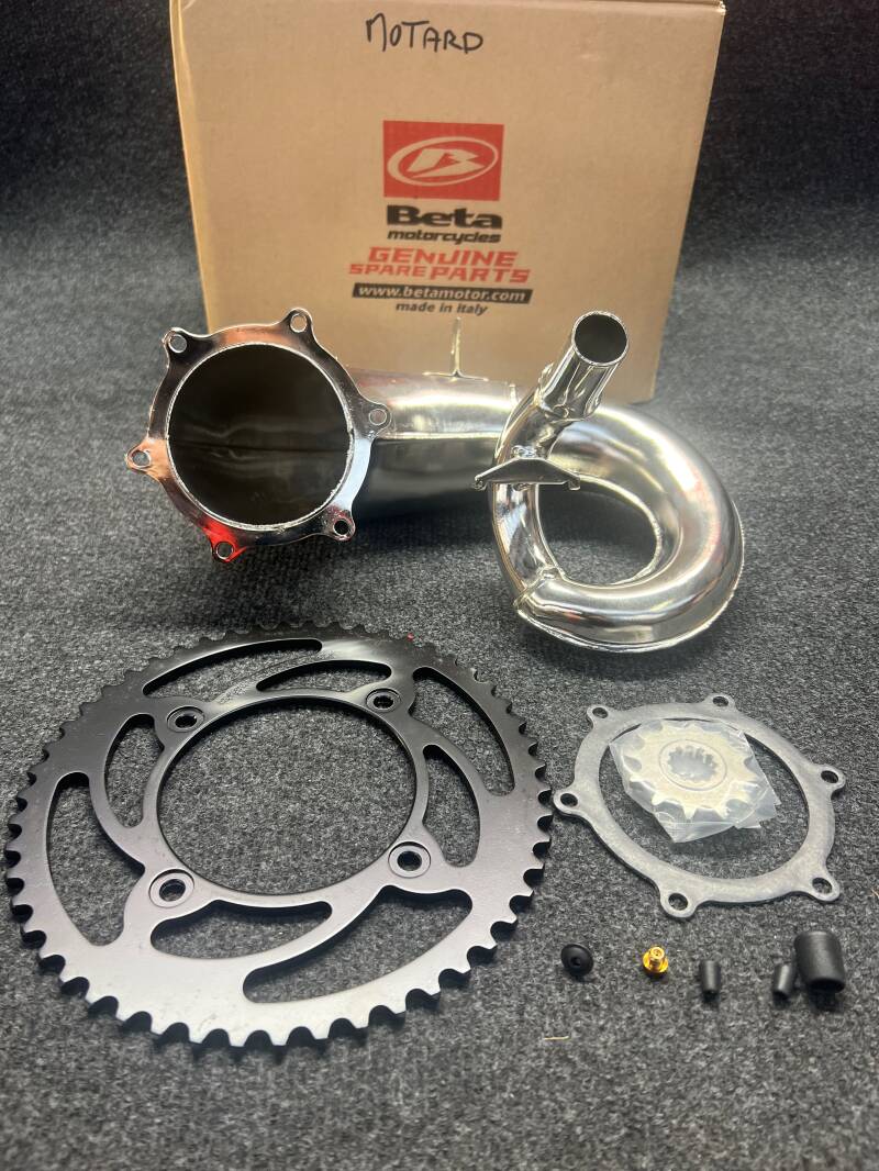 Le kit débridage pour vos Beta Supermotard RR 50cc EURO5 d'après 2021. Celui-ci permet de libérer le moteur Minarelli AM6 afin qu'il monte en régime normalement. Comme les plus grosses brides sont placées au niveau du collecteur d'échappement, ce kit est doté justement d'un autre modèle vidé, en même finition chromé, qui se monte en lieu et en place. Évidemment comme le moteur s'exprime mieux, le kit prévoit un pignon et une couronne pour rallonger la transmission, et enfin un gicleur principal plus gros pour enrichir la carburation. Il ne restera plus qu'à changer le CDI de la moto par un modèle du type BOITIER CDI DÉBRIDÉ DOPPLER, pour finir de débrider complètement la moto et pouvoir ainsi en profiter normalement.