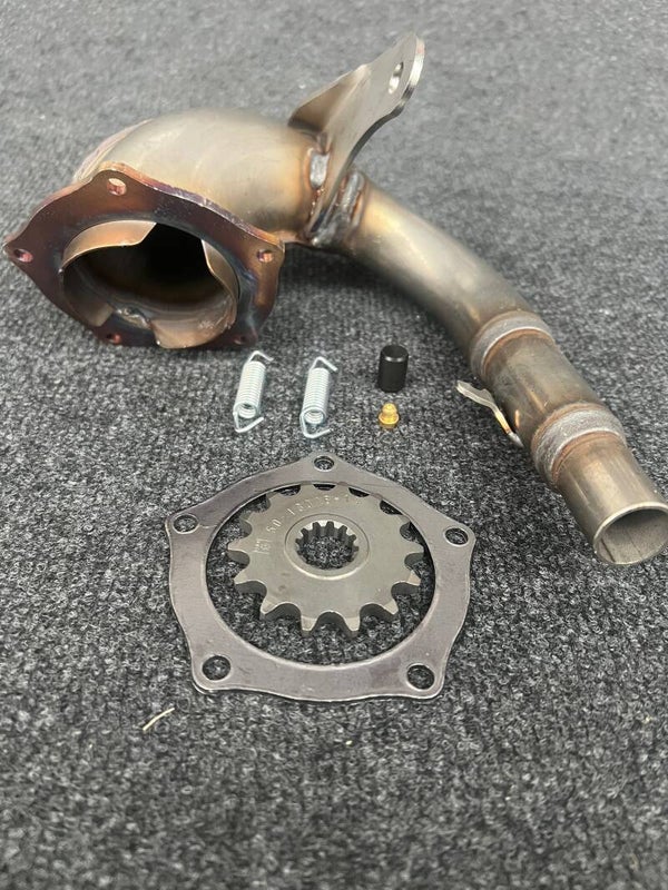 Le kit débridage pour vos RIEJU Supermotard MRT 50cc EURO5 PLUS A PARTIR DE 2025 2026. Celui-ci permet de libérer le moteur Minarelli AM6 afin qu'il monte en régime normalement. Comme les plus grosses brides sont placées au niveau du collecteur d'échappement, ce kit est doté justement d'un autre modèle vidé, en même finition INOX, qui se monte en lieu et en place. Évidemment comme le moteur s'exprime mieux, le kit prévoit un pignon pour rallonger la transmission, et enfin un gicleur principal plus gros pour enrichir la carburation. Et un bouchon pour obturer la boîte à air Il ne restera plus qu'à enlever un fil sur le CDI de la moto (écrit sur un document envoyé avec votre kit de débridage)pour finir de débrider complètement la moto et pouvoir ainsi en profiter normalement.